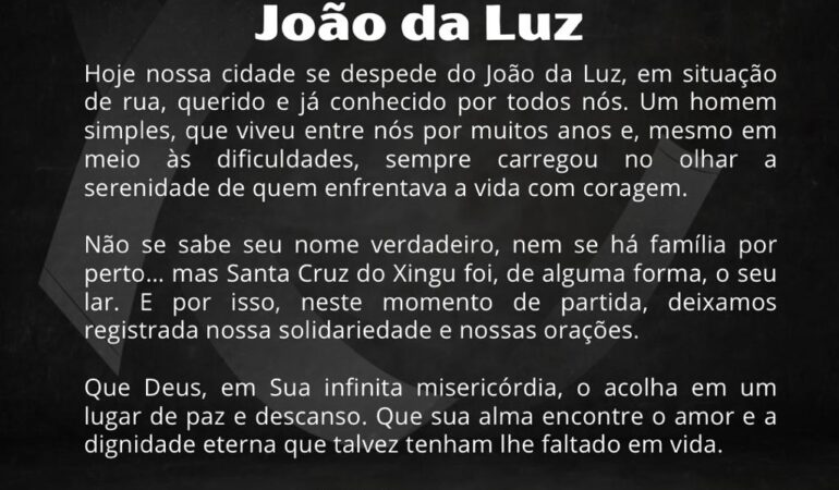 Hoje nossa cidade se despede de João da Luz, em situação de rua, querido e já conhecido por todos nós. Um homem simples, que viveu entre nós por muitos anos e, mesmo em meio às dificuldades, sempre carregou no olhar a serenidade de quem enfrentava a vida com coragem.